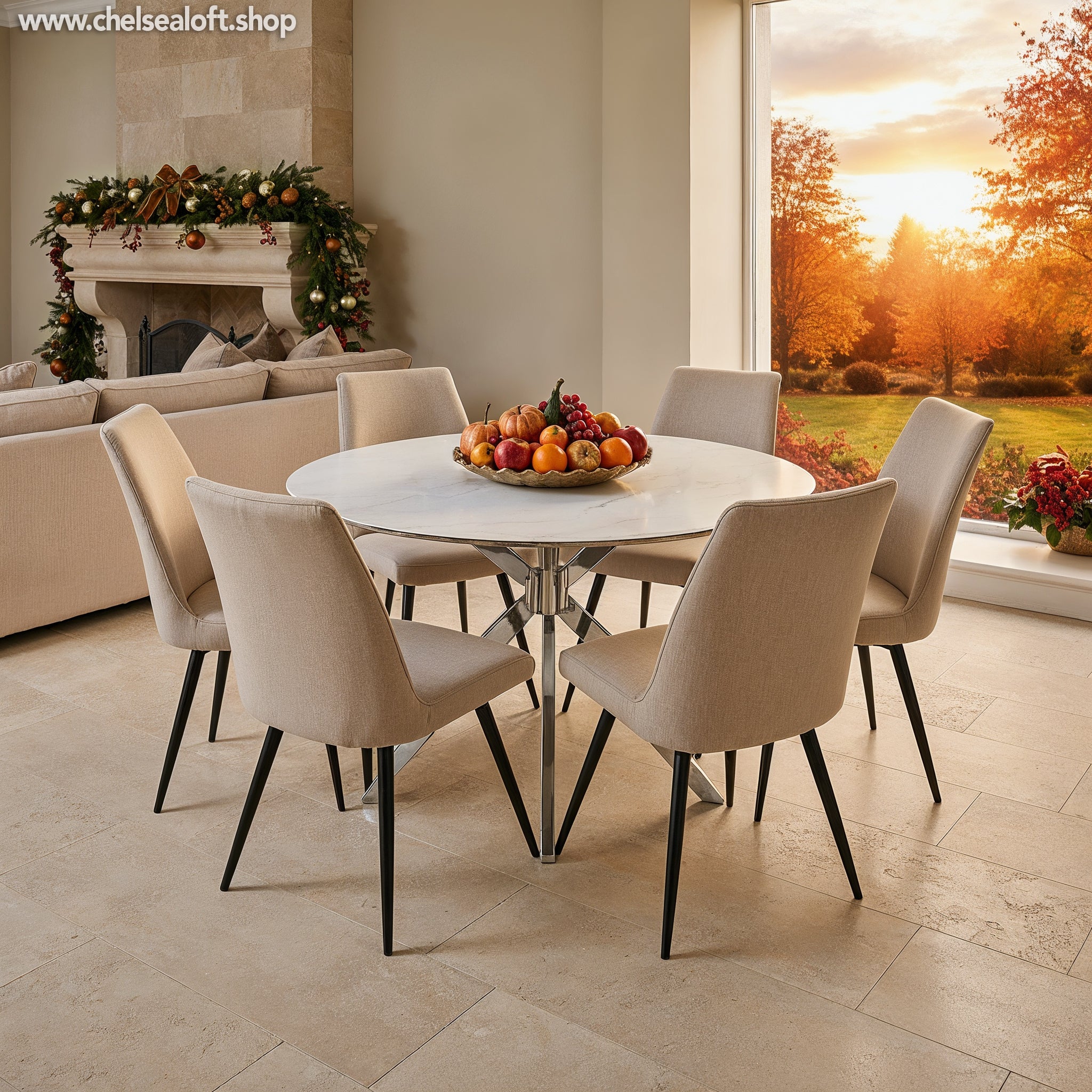 TC2411BC Mesa Redonda 120cm. Cerámica Blanca Nube y Base Cromo